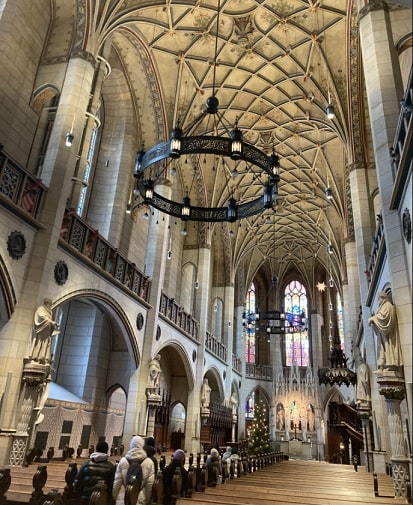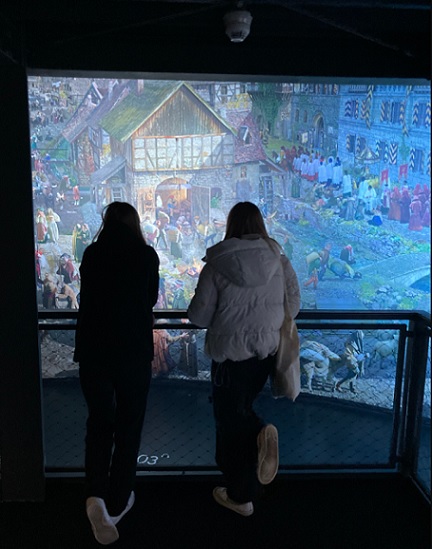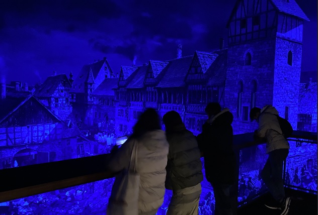 Direkt im Anschluss sahen wir uns das Aushängeschild Wittenbergs, die Thesentür, an. Auf eigene Faust erkundeten wir die Schlosskirche, bewunderten die imposanten, farbenfrohen Fenster und genossen den Ausblick von dem Kirchturm. Auch der detailreich gearbeitete Altar, die vielen Figuren wichtiger Wittenberger Persönlichkeiten und Martin Luthers Ruhestätte beeindruckten uns. Unsere Freizeit nutzten wir, um uns ein wenig zu entspannen bevor bereits der nächste Programmpunkt folgte. Dabei handelt es sich um den Besuch der Rotunde des Künstlers Yadegar Asisi, ein begehbares Panoramabild, das Wittenberg 1517 zeigt. Dieses konnte auf verschiedenen Ebenen betrachtet werden und erwachte durch Sound- und Lichteffekte zum Leben. Danach verabschiedeten wir uns von Wittenberg und traten nach diesen erlebnisreichen Tagen, die Heimfahrt an. Alles in allem, war es eine gelungene Exkursion mit vielen lehrreichen Aspekten und gemeinschaftlichem Miteinander.