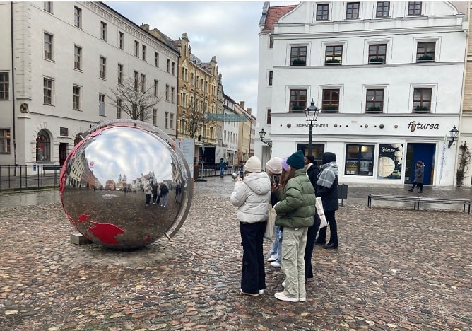 Anschließend besuchten wir das Haus der Geschichte, in dem uns Audioguides durch zwei Ausstellungen führten. Die erste ließ uns ins DDR-Leben der 40er bis 80er Jahre eintauchen und bildete durch authentisch gestaltete Wohnräume die damalige Lebenswirklichkeit ab. Die zweite Ausstellung gab uns einen Einblick in den Atheismus zu Zeiten der DDR und war so thematisch sehr passend. Am Abend fand ein geselliges Beisammensein beider Kurse in einem italienischen Restaurant statt, bei dem wir den Tag in der Gruppe Revue passieren ließen. Nach einer erholsamen Nacht und einem stärkenden Frühstück in der modern eingerichteten Jugendherberge waren wir gewappnet, um die zweite Führung mit unserem sympathischen Stadtführer Herr Glaubig anzutreten. Dieser erzählte als Zeitzeuge von persönlichen Erlebnissen in seiner Jugend in Bezug auf das Thema „Kirche in der DDR“. Er sprach insbesondere von den Erfahrungen, die er in seiner Jugendgemeinde sammelte und den Herausforderungen, sich als Gläubiger in eine von DDR Organisationen geprägten Schulgemeinschaft einzubinden. Dabei lernten wir durch seinen sehr persönlichen und authentischen Stil des Vortrags viele weitere Ecken Wittenbergs kennen.