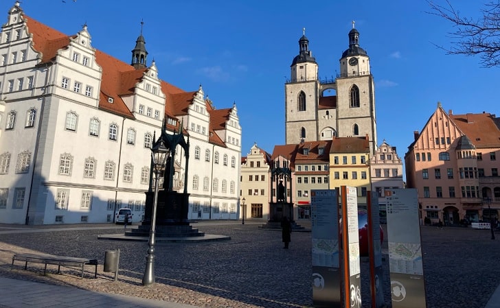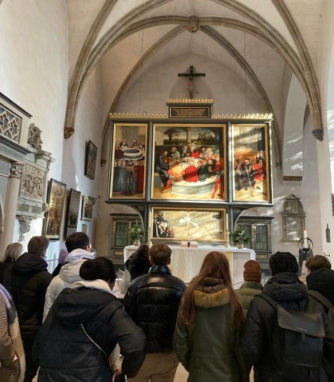 Am ersten Tag besuchten wir die Stadtkirche – dort hat Martin Luther zu Lebzeiten gepredigt- und lernten im Rahmen einer Führung viel Neues über die Reformation und die dort anzuschauenden Bilder Lukas Cranachs. Im Mittelpunkt stand das Altarbild der Kirche, das in drei Bildtafeln die Taufe Jesu, das Abendmahl und die Beichte zeigt. Von dort machten einige noch einen kurzen Abstecher in die Cranach-Höfe, wo dieser reiche und angesehene Wittenberger Bürger seine Wohn- und Werkstätten hatte.