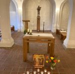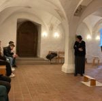 Viele Fragen schwirrten in unseren Köpfen umher und warteten auf Antworten. Doch erst einmal gab es nach einer freundlichen Begrüßung bei Kaffee und Tee eine Führung durch die Klosteranlage, durch die uns Geschichte und Architektur sowie die heutige Nutzung des Klosters vermittelt wurde. Bei der Mittagsandacht in der Krypta, der wir als Gäste beiwohnten, konnten wir beim Klang von Harfe und Taizé-Gesängen diese Informationen sacken lassen.