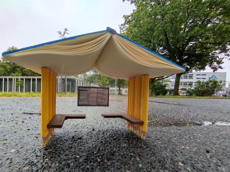 Unsere Schule hat keine eigene Haltestelle – aber was wäre, wenn doch?! Im Kunstunterricht der ehemaligen Klasse 10a sind zum Thema Architektur diese Modelle von