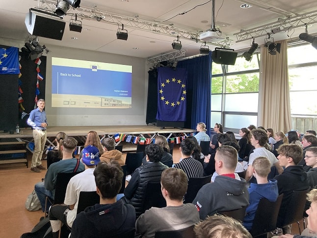 Am 22.05.2023 haben wir 10ten Klassen die tolle Möglichkeit bekommen, an dem EU-Programm ,,Europa in der Schule- back to school“ teilzunehmen! Das Ganze lief in Form eines zweistündigen Vortrags ab, für den extra ein Batterieforscher aus einem Labor aus den Niederlanden zu uns gekommen ist: Dr. Stephan Hildebrandt arbeitet in Petten bei Alkmaar unter anderem an batteriebetrieben Autos und deren Sicherheit, aufgewachsen ist er in der Region Hannover.