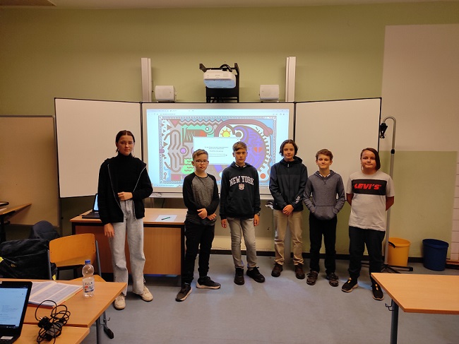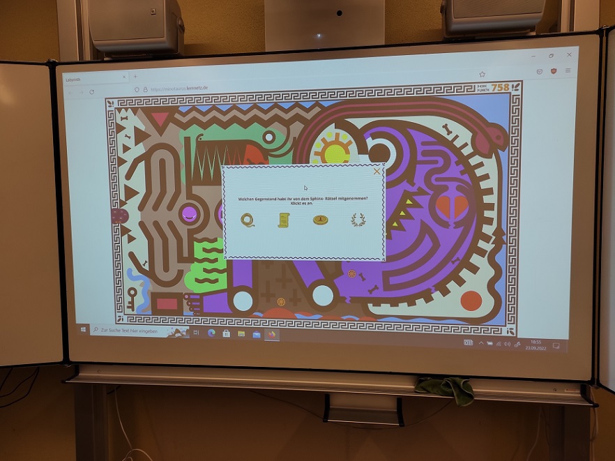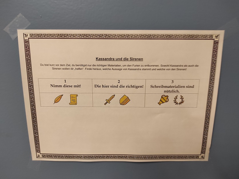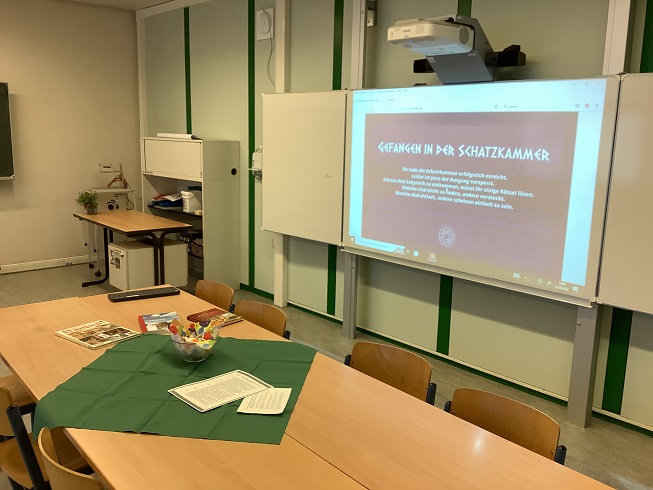 Die in Schleswig-Holstein entwickelte Online-Schatzsuche „Gefangen im Labyrinth. Ein Escape-Spiel für Schülerinnen und Schüler mit starken Nerven“ ging in die zweite Runde und begann um 18.30 Uhr. Diesmal nahmen sechs Teams von Jahrgang 6-9 teil und rätselten sich in getrennten Räumen durch knifflige Fragen zur Antike, betraten Irrwege, mussten in der Schule versteckte Hinweise finden, verloren Lebenspunkte für falsche Antworten und kamen doch den Schlüsseln zum Ausgang und diesem selbst mit Geduld, Kombinationsgabe und Einfallsreichtum immer näher. Das große Computer-Spielfeld zeigte nach und nach neue Möglichkeiten, um Hinweise und Schlüssel zu finden. Eine „Denkertheke“ mit Büchern und Laptop zum Nachschlagen und süße Nervennahrung standen dabei für jede Art Hilfe bereit. Das war auch nötig, wenn man sich mit Hieroglyphen, Geheimcodes, dem griechischen Alphabet, auf dem Spielfeld versteckten Hinweisen, römischen Zahlen, Bilderrätseln und antiker Mythologie und Geschichte herumzuschlagen hatte. Aber zum Glück gab es diesmal tatkräftige Unterstützung: Schülerinnen und Schüler des Lateinkurses des 11. Jahrgangs hatten sich bereit erklärt, den Teilnehmern der Schatzsuche zu helfen. Vielen Dank für diese tolle Unterstützung!