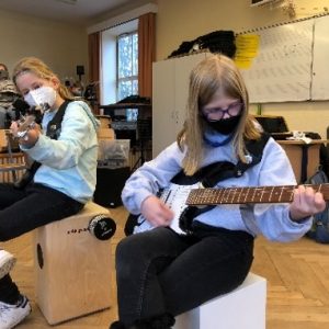 Da das Singen zurzeit generell nur unter einschränkenden Auflagen möglich ist, nutzen wir in der aktuellen Chor:Klasse in Jahrgang 5 die neu angeschafften Instrumente, um das Klassenmusizieren in den Mittelpunkt unserer Arbeit in diesem Schuljahr zu stellen. Wir haben die Schülerinnen und Schüler zunächst an die Instrumente herangeführt. Das beginnt mit der Handhabung der E-Bässe und E-Gitarren; die Schülerinnen und Schüler lernen, die Instrumente zu stimmen, machen sich mit Noten und Saitennamen vertraut und spielen erste Töne und Akkorde.