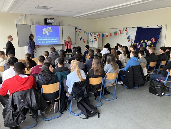 Die 11b und die 11d haben am 26.04.2024 an einer EU-Veranstaltung mit dem Motto „Du hast es in der Hand“ in der Schule teilgenommen. Zu Beginn gab es ein Quiz namens „Wer wird Europameister?“ mit drei verschiedenen Themen, die auch passend zu den bevorstehenden Wahlen zum EU-Parlament am 09.06.2024 sind. Wenn eine Frage unverständlich war, wurden diese auch von Herrn Kraus vom Verein „Bürger Europas“ ausführlich erklärt. Uns wurden Fernbedienungen verteilt, um die Fragen beim Quiz beantworten zu können und wenn die Antwort erschien, wurde uns auch genauer etwas über die Antwort erzählt. Wer die richtige Antwort hatte, hat auch einen Preis erhalten, was wir gut fanden. Nach dem Quiz gab es eine Pause, in der sich alle Teilnehmer erholen konnten. Anschließend kam die Abgeordnete des Europäischen Parlaments, Viola von Cramon und wir hatten die Möglichkeit, ihr Fragen zu stellen. Dabei wurden ganz unterschiedliche Themen besprochen: Die Rolle der EU im russischen Angriffskrieg gegen die Ukraine, die Erweiterung der EU, den Krieg im Gazastreifen, der Konflikt zwischen Serbien und dem Kosovo, und und und. Sie hat diese Fragen dann beantwortet. Ein besonderer Dank geht am Maximilian Herche aus der 11b, der die Fragerunde spontan und sehr kompetent moderiert hat.