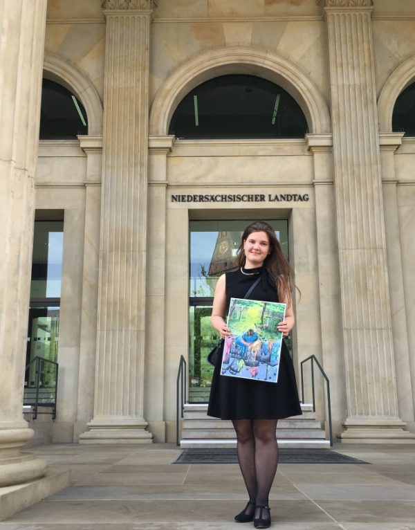Eine Urkunde, überreicht vom Landtagsvizepräsidenten persönlich, erhält man nicht alle Tage. Für Vivien Bencsik (11d) war es vergangenen Dienstag soweit. Sie hatte im Fach Kunst am Europäischen Wettbewerb teilgenommen und für ihr eingereichtes Bild den Bundespreis erhalten. So viel kreativer Einsatz für die Europäische Bewegung wurde entsprechend belohnt. Bernd Busemann (MdL) überreichte Vivien die Siegerinnenurkunde. Zum Preis gehört außerdem die Teilnahme an einem viertägigen Europa-Seminar der Friedrich-Ebert-Stiftung in Straßburg im September. Dort wird Vivien auch auf verschiedene Abgeordnete des Europaparlaments treffen. Herzlichen Glückwunsch!