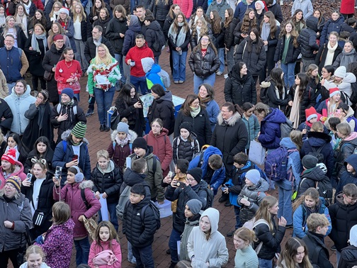 „Gebt mir ein ‚H‘ – gebt mir ein ‚O‘ – gebt mir ein ‚HO HO HO!‘ ging aus hunderten Kehlen ein Gruß raus an Santa Claus. Streckenweise hüpften sich Schüler und Lehrer ekstatisch im Takt durchs Lied hindurch. Auch Eltern waren extra gekommen, und hatten sichtlich Freude am Geschehen. Externe Gäste hatten die frohe Kunde erlangt über den Offenen Adventskalender im Stadtteil und waren dazugestoßen. Kurzum, es war ‘ne richtige Sause.