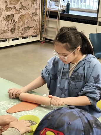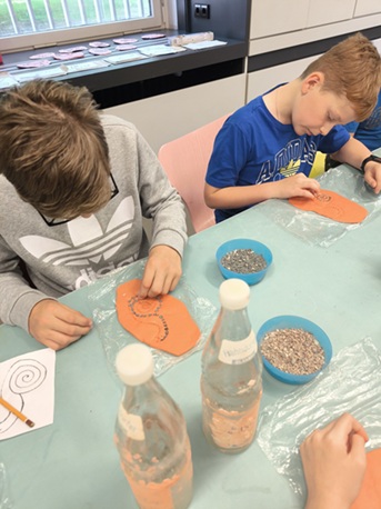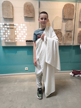 In schon guter Tradition ging es wieder kurz vor den Sommerferien mit dem diesjährigen Lateinkurs des 6. Jahrgangs ins Kestnermuseum. Man studierte in der Führung „Altes Rom“ anhand eines Modells die Bauweise eines reichen Stadthauses in Rom, wie man sich damals klimatisch geschickt vor Hitze schützte, und lernte, wie man sauberen Fußes von einer Straßenseite zur anderen wechseln konnte. Die Grabinschrift für einen schon mit dreizehn Jahren verstorbenen Jungen konnten die Schülerinnen und Schüler mit ihren Lateinkenntnissen schon ganz gut verstehen und einer von ihnen ließ sich mit einer richtigen Toga würdevoll ausstatten, wobei die Ankleidezeit bei uns viel kürzer sein musste, als sie im alten Rom tatsächlich gewesen war. Höhepunkt des Besuchs war ein Orpheus-Mosaik, das jenen begnadeten Sänger darstellt, wie er auf seiner Lyra spielt und dabei von wilden und sanften Tieren aller Art friedlich umgeben ist. Im anschließenden Workshop durfte man dann ein eigenes kleines Mosaik herstellen und dafür jene Tiere aus dem Mosaik als Vorlage nutzen.