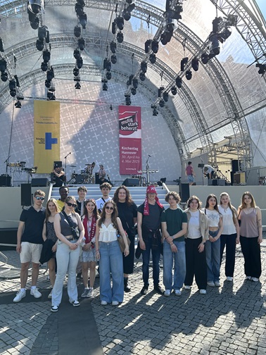 Als vom 30.04.-04.05.2025 der 39.Deutsche Evangelische Kirchentag in Hannover stattfand und das Kurt-Schwitters-Gymnasium als Quartierschule hunderte Gäste beheimatete, durften sich unsere Schülerinnen und Schüler über außerplanmäßige Ferien freuen. Interessierte Mitglieder der Religionskurse der Jahrgänge 5, 7 und Q1 sowie des Seminarfachs „Religion & Gesellschaft“ investierten die freie Zeit und besuchten mit Frau Püschl und Herrn Kalski an mehreren Tagen die Veranstaltungen des Kirchentags. Ob sich dieses Engagement gelohnt hat? Seht und lest selbst, was sie zu berichten haben: