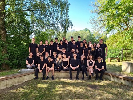 Kreativität, Bühne, Schauspiel sind drei Wörter, die vom 13.05.2024 bis zum 15.05.2024 für die Schüler:innen der Darstellendes Spiel – Kurse von Frau Woller und Herrn Kalski eine zentrale Bedeutung einnahmen. In diesen drei Tagen machten die beiden DS-Kurse der Q1 eine Probenfahrt nach Hambühren. Um das Stück „Die Nacht ist nicht allein zum Schlafen da“ zum Leben erwecken zu können, fehlt im Unterricht leider ausreichend Zeit, weswegen eine Theaterfahrt die beste Lösung zu sein schien. Und diese war ein voller Erfolg. Drei Tage lang haben sich alle Beteiligten tiefgründig mit Szenen beschäftigt, die verdeutlichen sollen, dass die Nacht nicht nur dem Schlaf dient. Drei Tage lang wurde sich bemüht die Facetten der Nacht, die vorab im Unterricht thematisiert worden sind, zusammenzutragen. Am Montagmorgen haben wir uns alle zunächst gemeinsam im Forum getroffen und die wichtigsten organisatorischen Aspekte besprochen. Nach einer eigenständigen Anreise begann das Arbeiten.