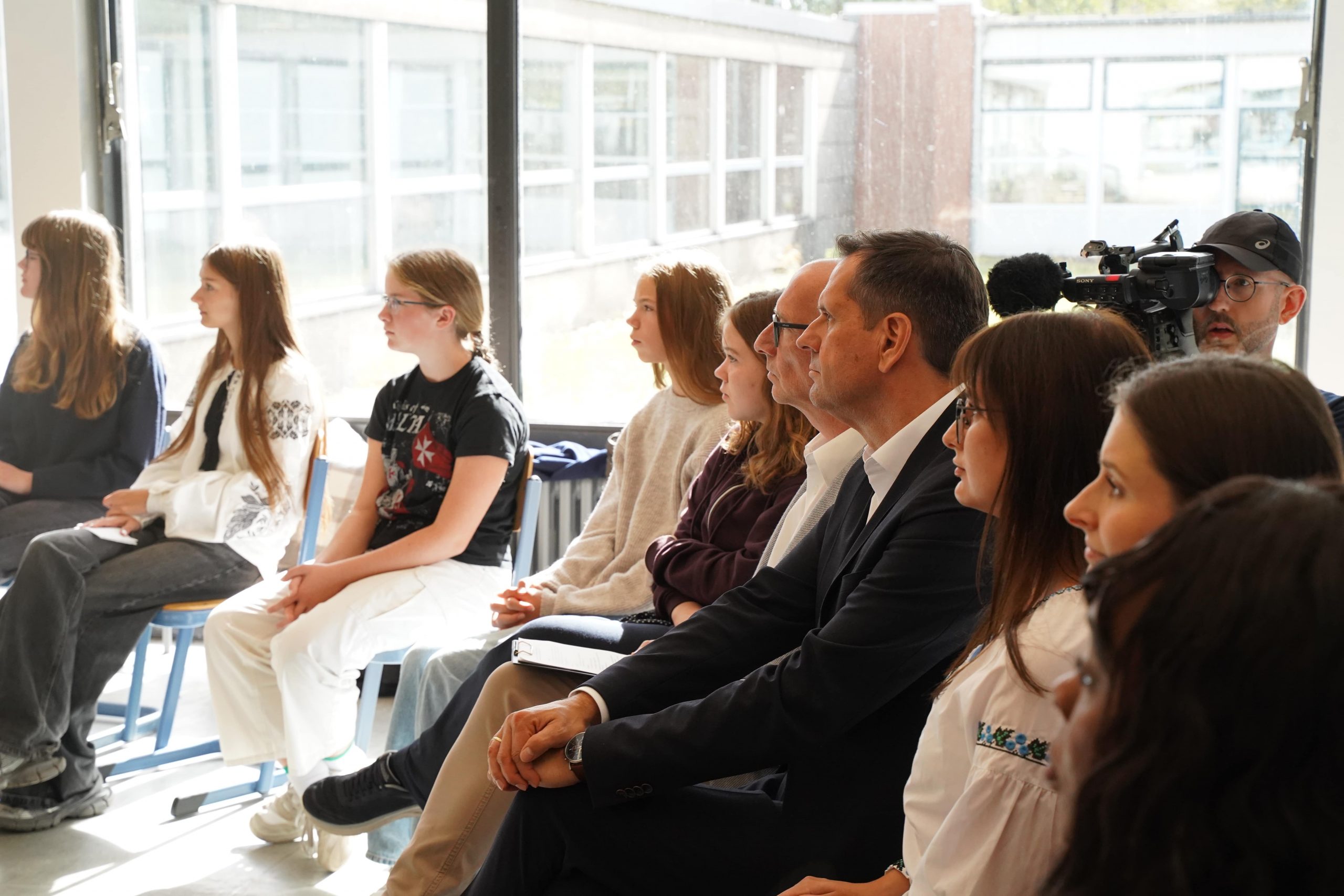 Am 16.09. besuchte der Ministerpräsident des Landes Niedersachsen unsere Schule. In einer Gesprächsrunde wurde ein kurzer Film gezeigt, der das Leben der ukrainischen Jugendlichen im vom Krieg geprägten Alltag dokumentiert. Der Kontrast zwischen ihrem Alltag und dem Leben der deutschen Schülerinnen und Schüler wurde hier auf berührende Weise deutlich. Der Ministerpräsident und unsere Schüler*innen zeigten sich sichtlich bewegt von der Offenheit und Stärke, mit der die ukrainischen Jugendlichen von ihren Erfahrungen erzählten und schilderten, wie die Kriegsereignisse ihren Lebensalltag prägen.