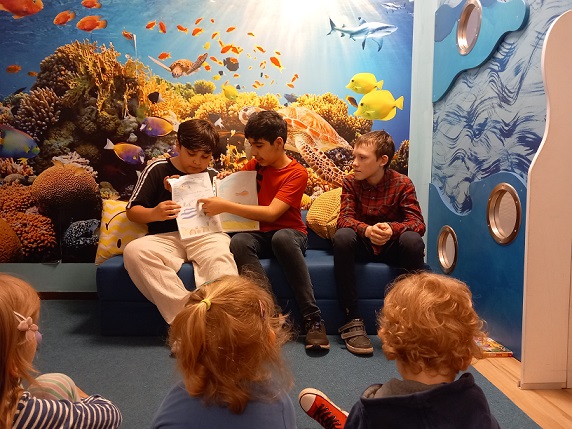 Am Donnerstag, den 08.06. erhielten die Kinder der Kindertagesstätte der St. Johannis Kirchengemeinde besonderen Besuch: Die Schülerinnen und Schüler unserer WortSpiel:Klasse! des sechsten Jahrgangs kamen mit ihren im Rahmen eines längeren Unterrichtsprojektes entstandenen Kinderbüchern vorbei, um daraus vorzulesen. Texte und Illustrationen haben unsere Schülerinnen und Schüler in Kleingruppen selbst erstellt. Das löste große Begeisterung bei den Kleinen aus und unsere Kinderbuchautor*innen waren sichtlich stolz darauf, dass ihre Ergebnisse so gut ankamen. Die Wort:Spiel:Klasse! ist eine unserer Profilklassen im 5. und 6. Jahrgang. Hier wird ein Unterrichtsblock pro Woche mit Wörtern und Sprache experimentiert und die Schüler*innen werden somit für einen künstlerisch-ästhetischen Umgang mit Sprache sensibilisiert.