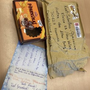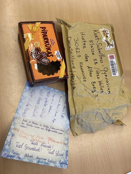 …hat die Bühnenklasse 5b erhalten. Anfang Dezember landete ein kleines Paket mit Grüßen und Pfefferkuchen für die Klasse im Briefkasten unserer Schule. Verfasst und versendet wurde es von der Klasse 5a der 66.Vidusskola aus Riga. Der Kontakt ist über den Erasmus+-Aufenthalt von Frau Woller und Herrn Kalski in der lettischen Hauptstadt entstanden. Die Kurt-Schwitters-5b hat sich sehr über die unerwartete Post gefreut und bereits Antwortbriefe mit Neujahrsgrüßen verfasst. Alle hoffen auf eine tolle (Brief-)Freundschaft!